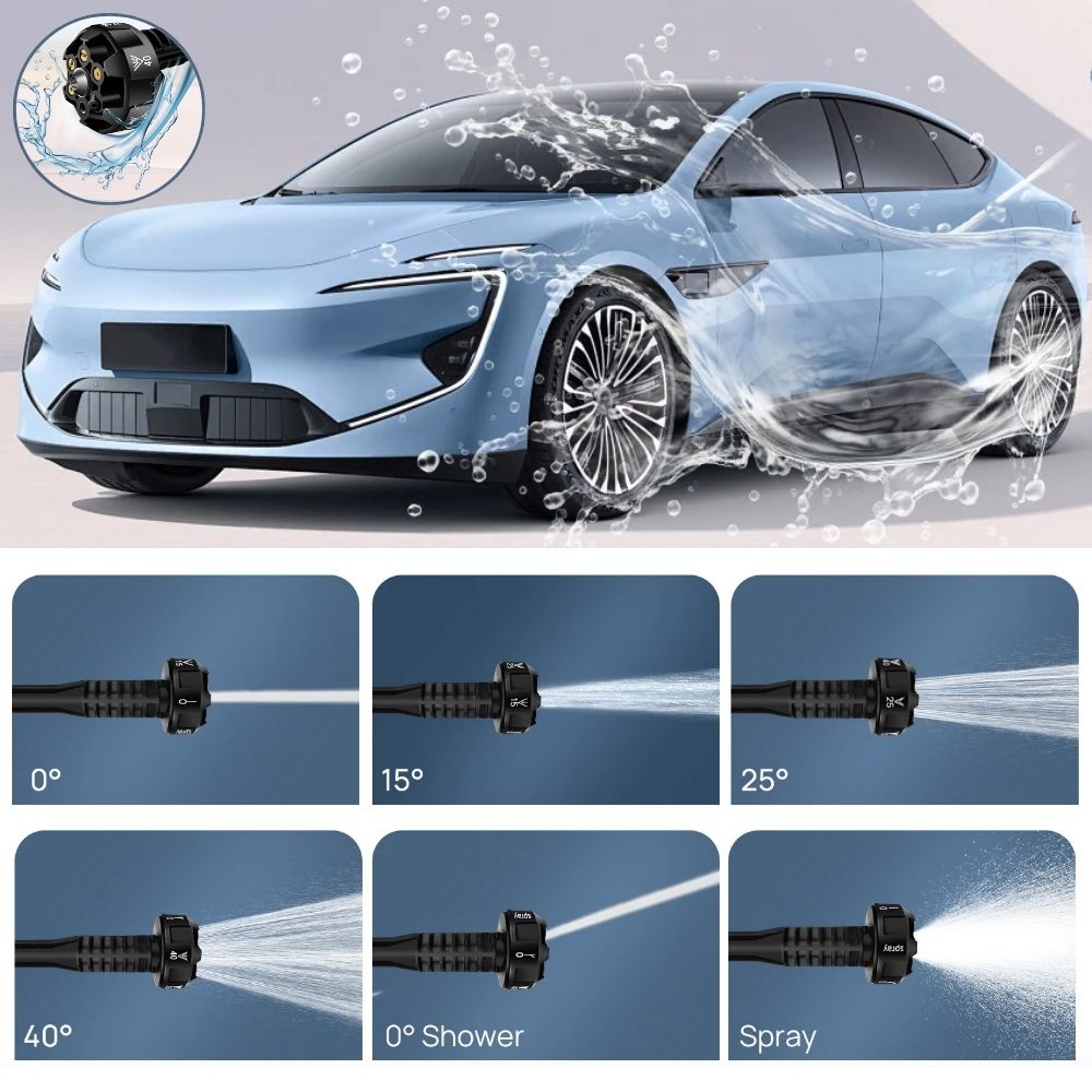 The 6-in-1 adjustable nozzle offers six different modes (0°, 15°, 25°, 40°, foam jet, shower mode) so that you can customize the cleaning. Whether washing the car, watering the garden or removing stubborn dirt - this high-pressure cleaner is versatile.