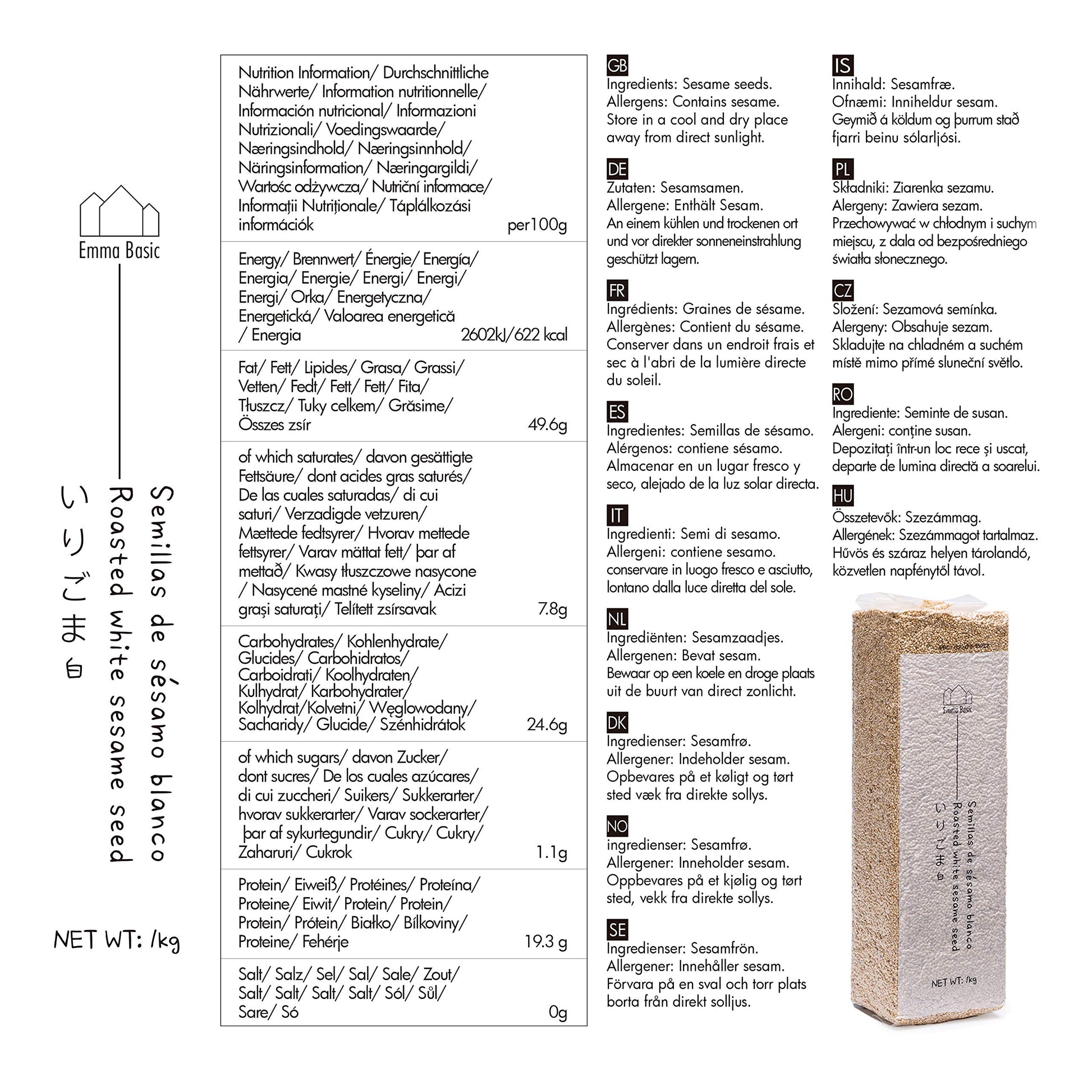 Emma Basic: Roasted white sesame seeds (1kg) with a nutty flavor