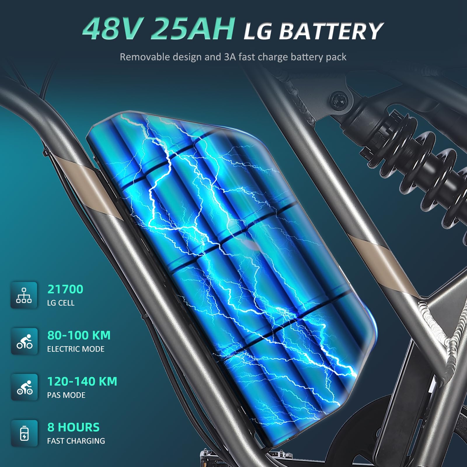 Battery: 48V 25Ah LG cells, range up to 140km, advanced 21700 technology