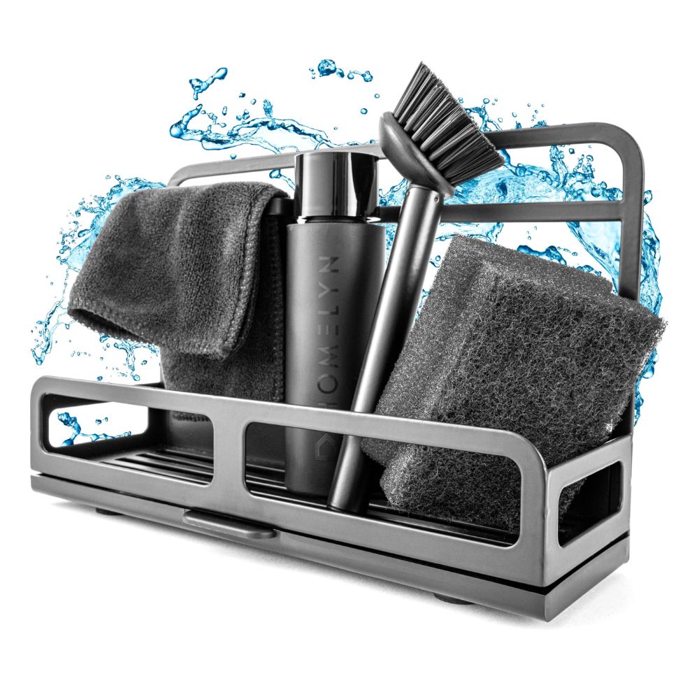 HOMELYN stainless steel sink organizer set including dish brush with drip tray: Modern design