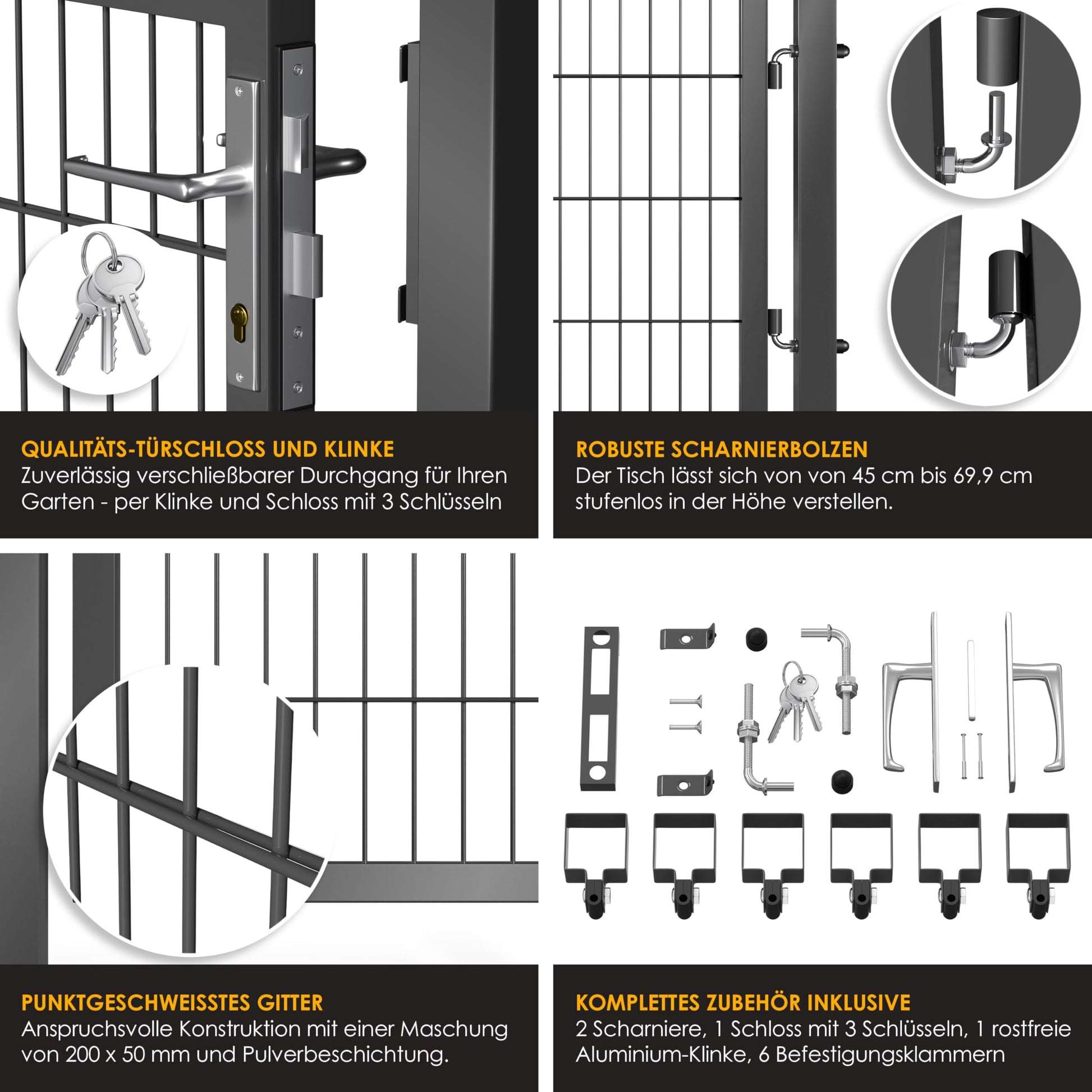 Security guaranteed: With a high-quality door lock and 3 keys, the gate reliably protects against burglary and prevents children or pets from leaving the property without authorization
