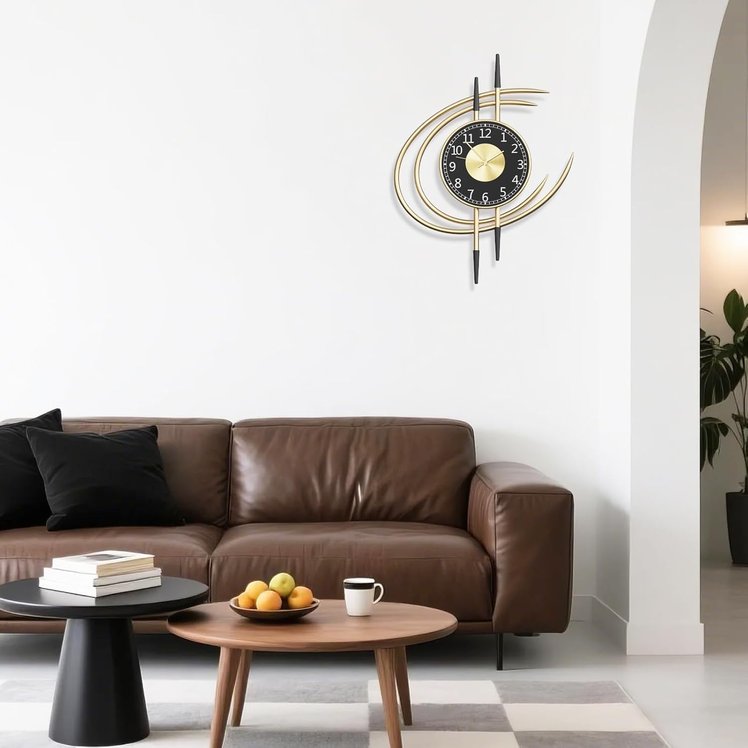 Large modern decorative wall clock (54cm) without ticking noise in gold-black design