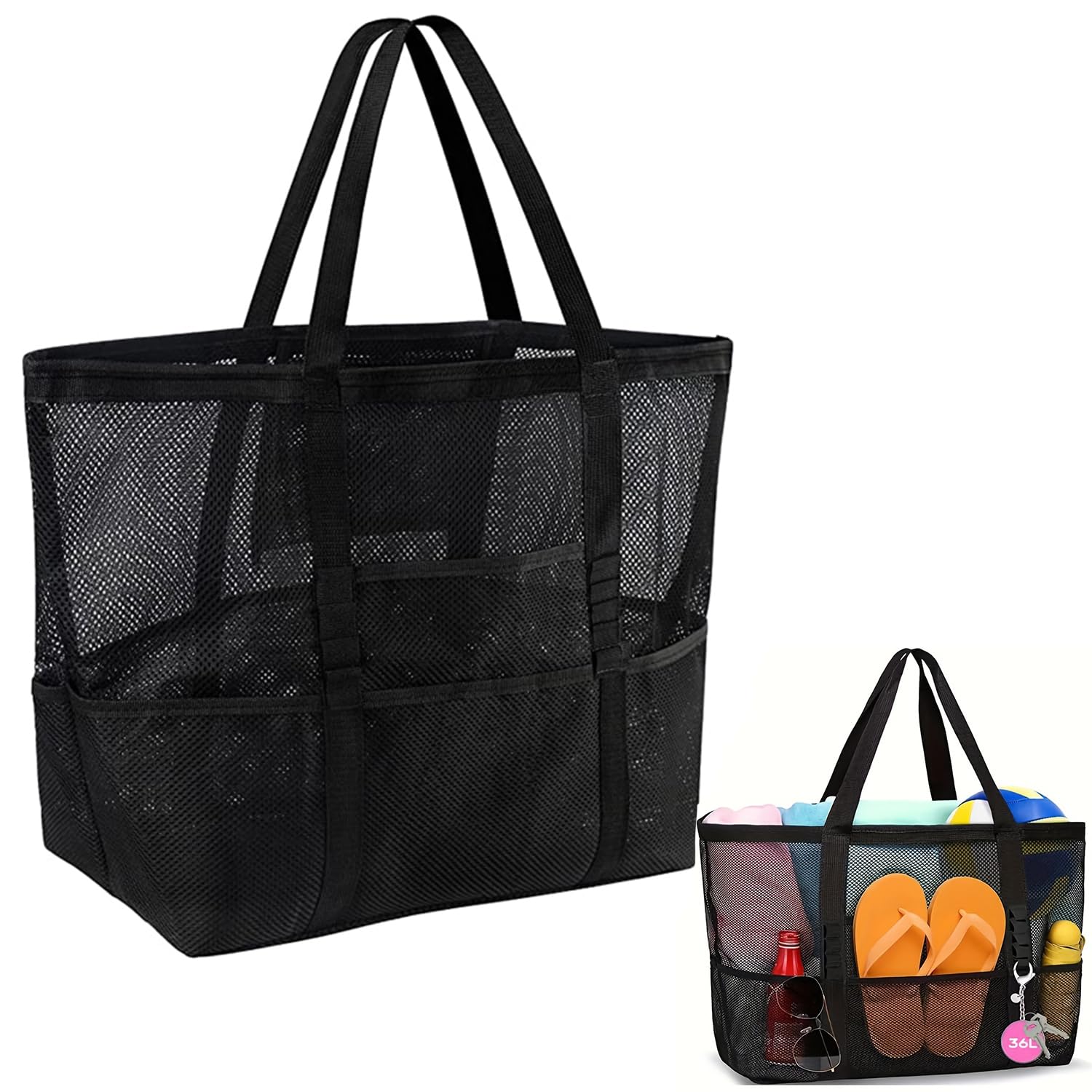Große Netz-Strandtasche mit Taschen & Reißverschluss für Strand, Urlaub, Reise