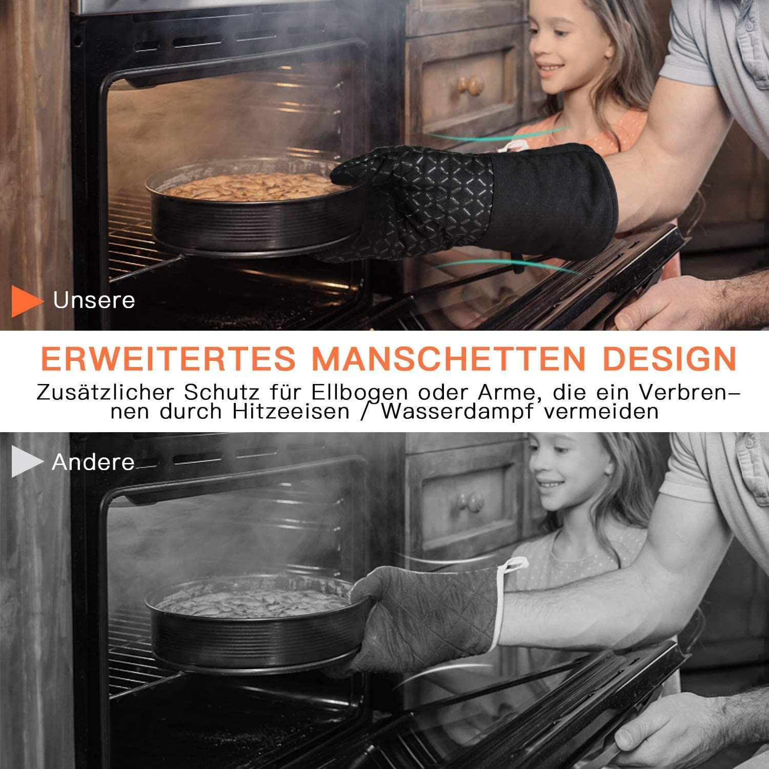 Hitzebeständigkeit –- Die Ofenhandschuhe bestehen aus Silikon und hitzebeständigem Baumwollgewebe, ideal für den Umgang mit Öfen, Herdplatten und Pfannen.
