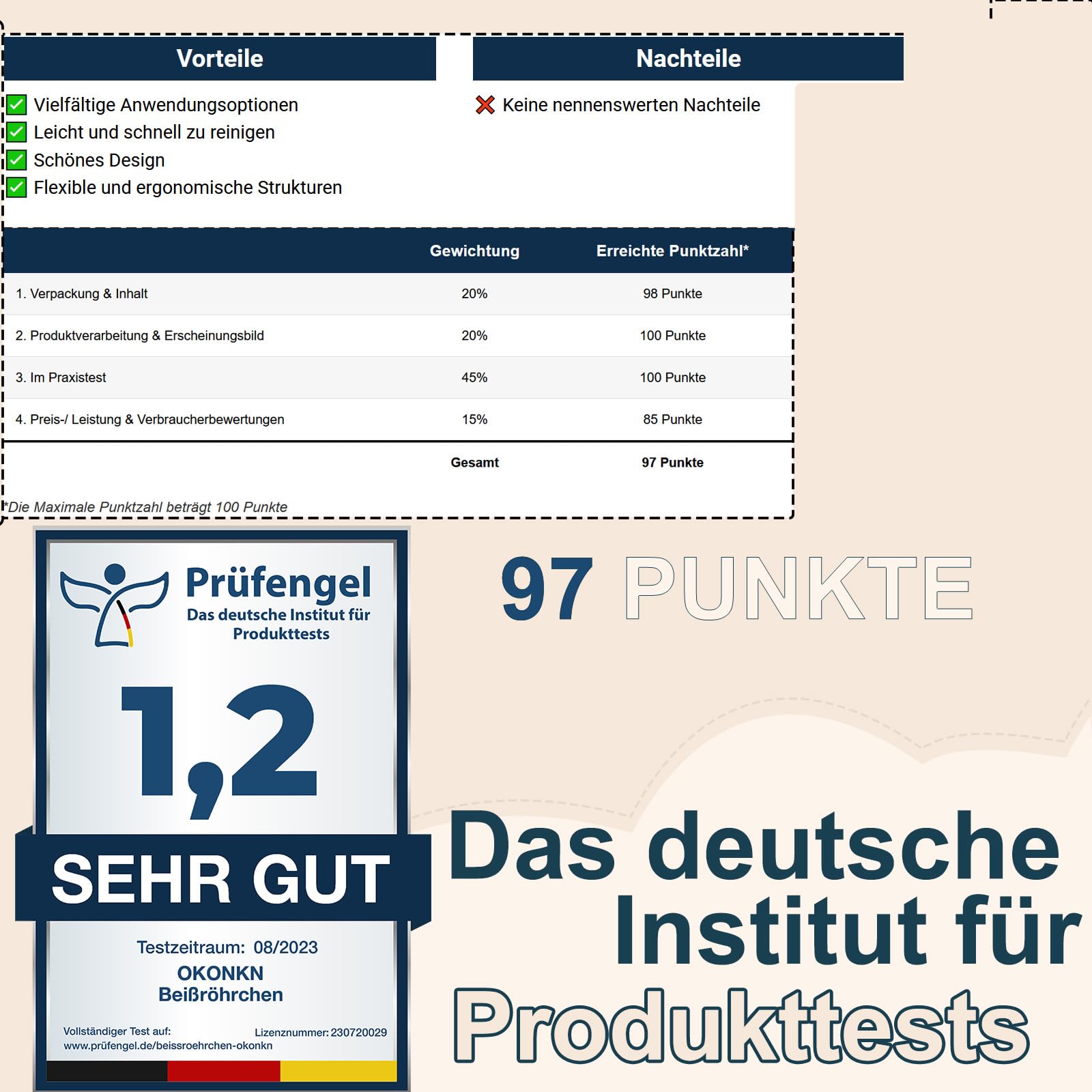 Die Beißröhrchen von OKONKN wurden im Praxistest als effektive Zahnungshilfe bewertet. Sie eignen sich ideal zur Zahnfleischmassage und bieten besonders gute Linderung bei Kühlung.