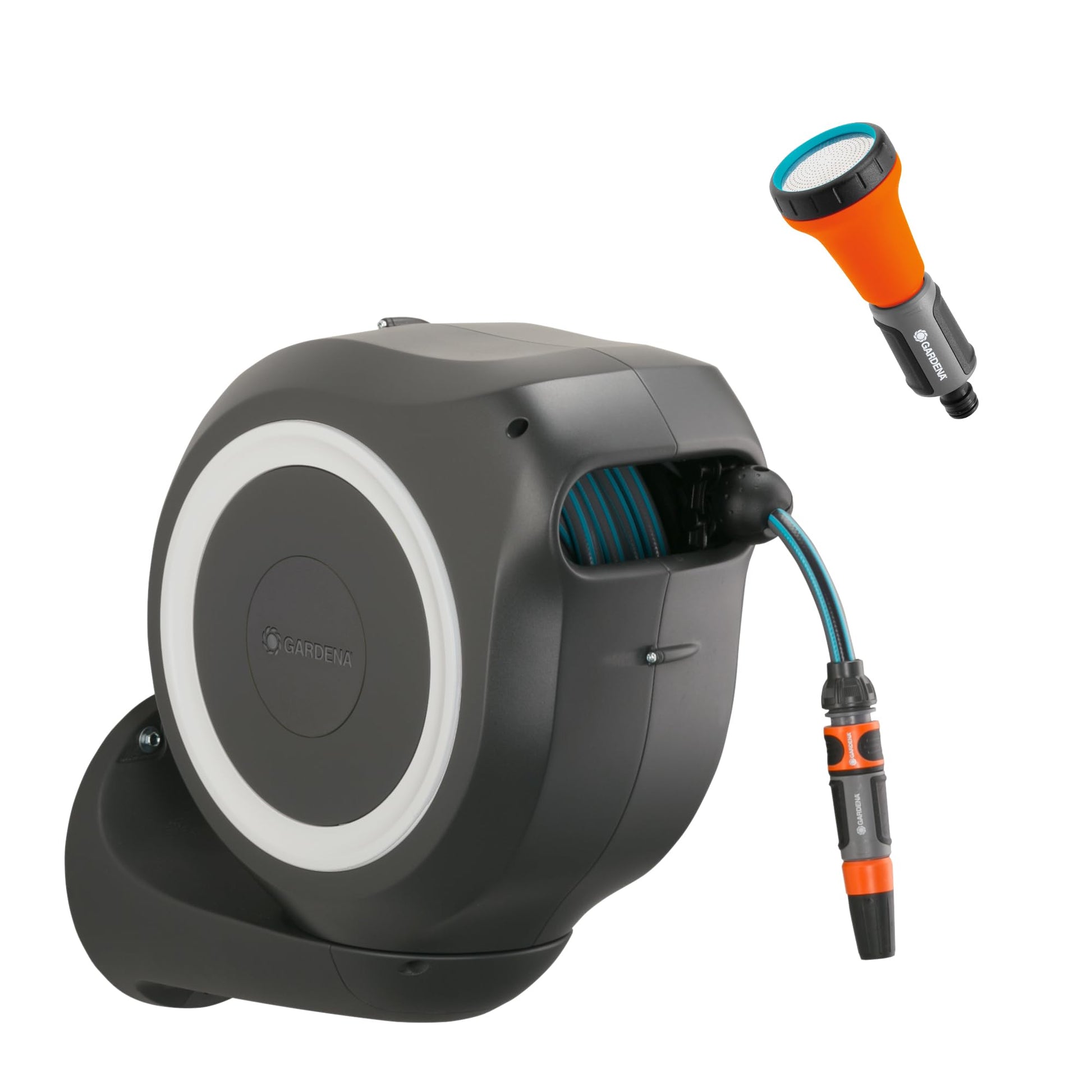 • Lieferumfang: 1x Gardena Wand-Schlauchbox, 1x Bewässerungsbrause, 1x 20 m Qualitätsschlauch (13 mm), 1x Anschlussschlauch, 1x Spritze, 1x Wandhalterung mit Schrauben und Dübeln