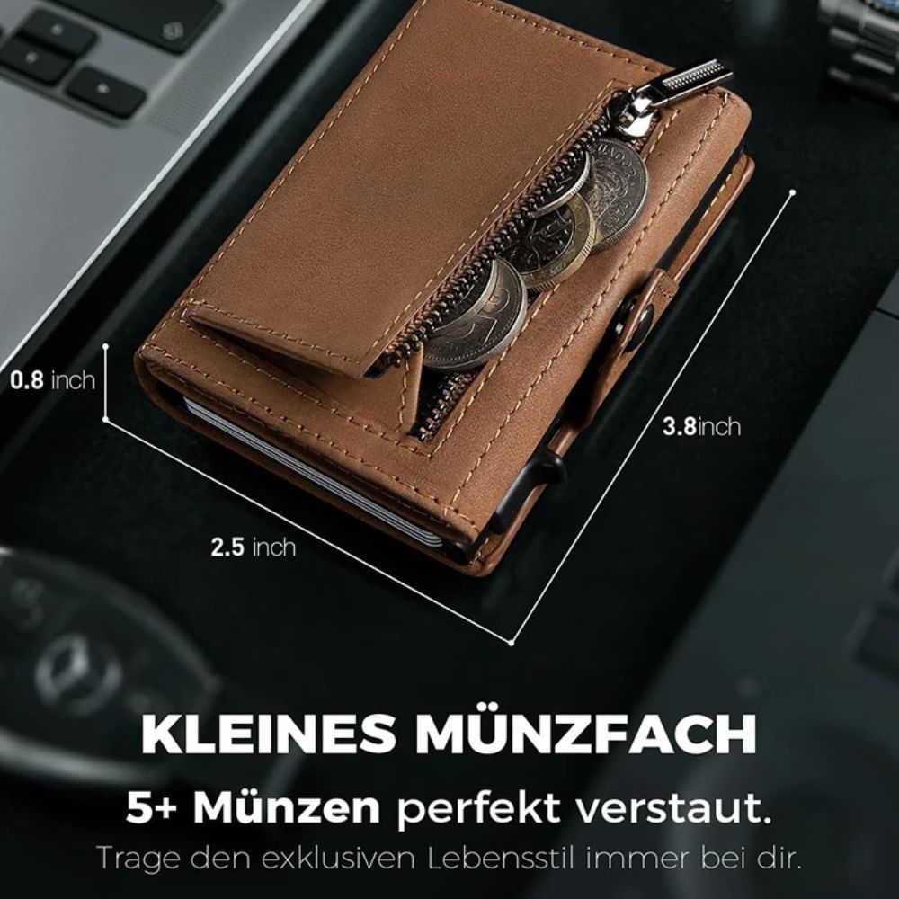 Auf der Rückseite befindet sich ein clever gestaltetes Münzfach, das bis zu 3-5 Münzen sicher aufbewahrt. So bleibt alles ordentlich und griffbereit, ohne Geldscheine mühsam falten zu müssen.