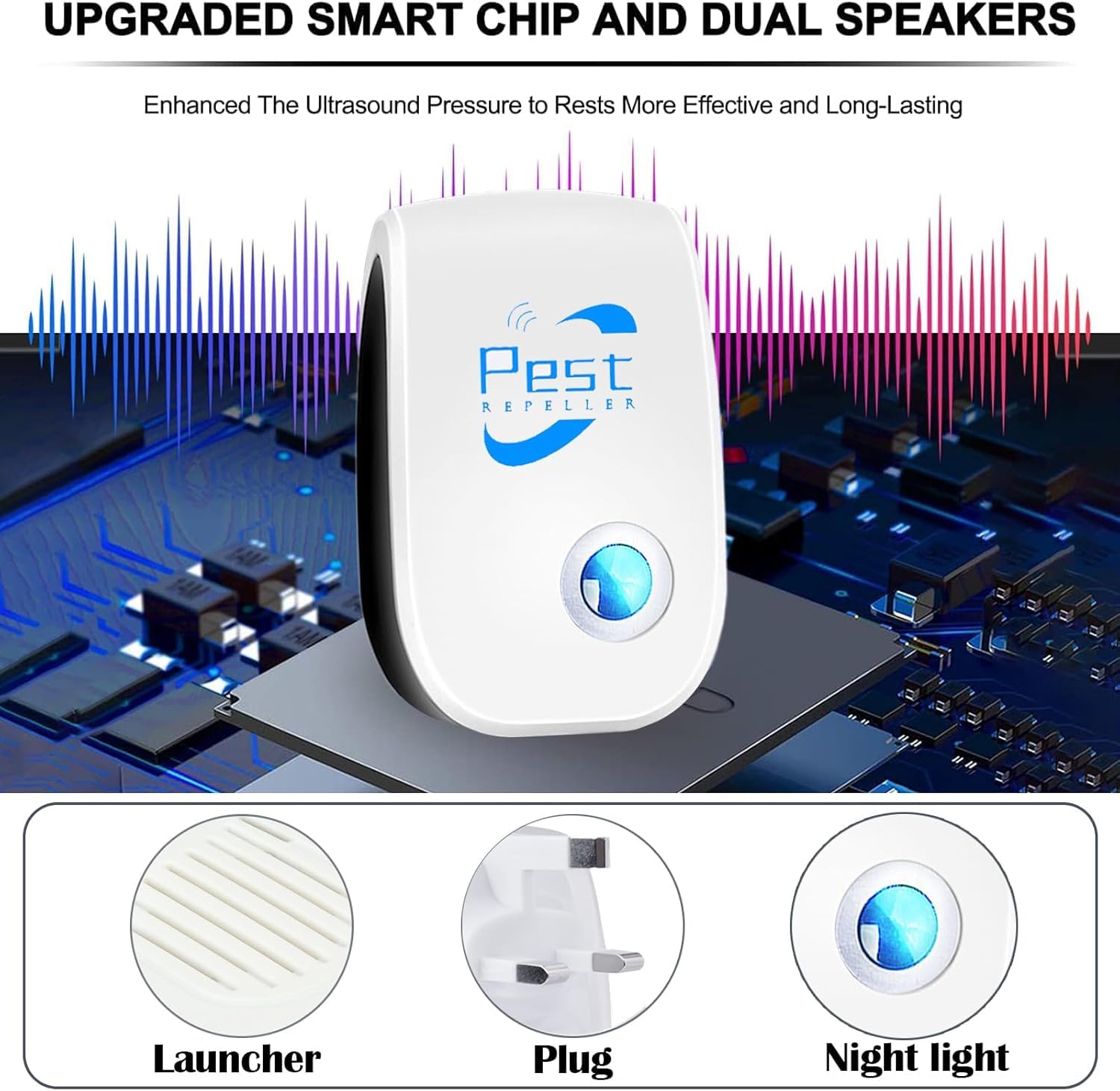 Verbesserte Ultraschall-Technologie: Kombiniert Ultraschall- und elektromagnetische Chips, die das Hör- und Nervensystem von Schädlingen wie Mäusen, Kakerlaken, Ameisen, Spinnen, Parasiten, Mücken, Fliegen und Flöhen stören und vertreiben.