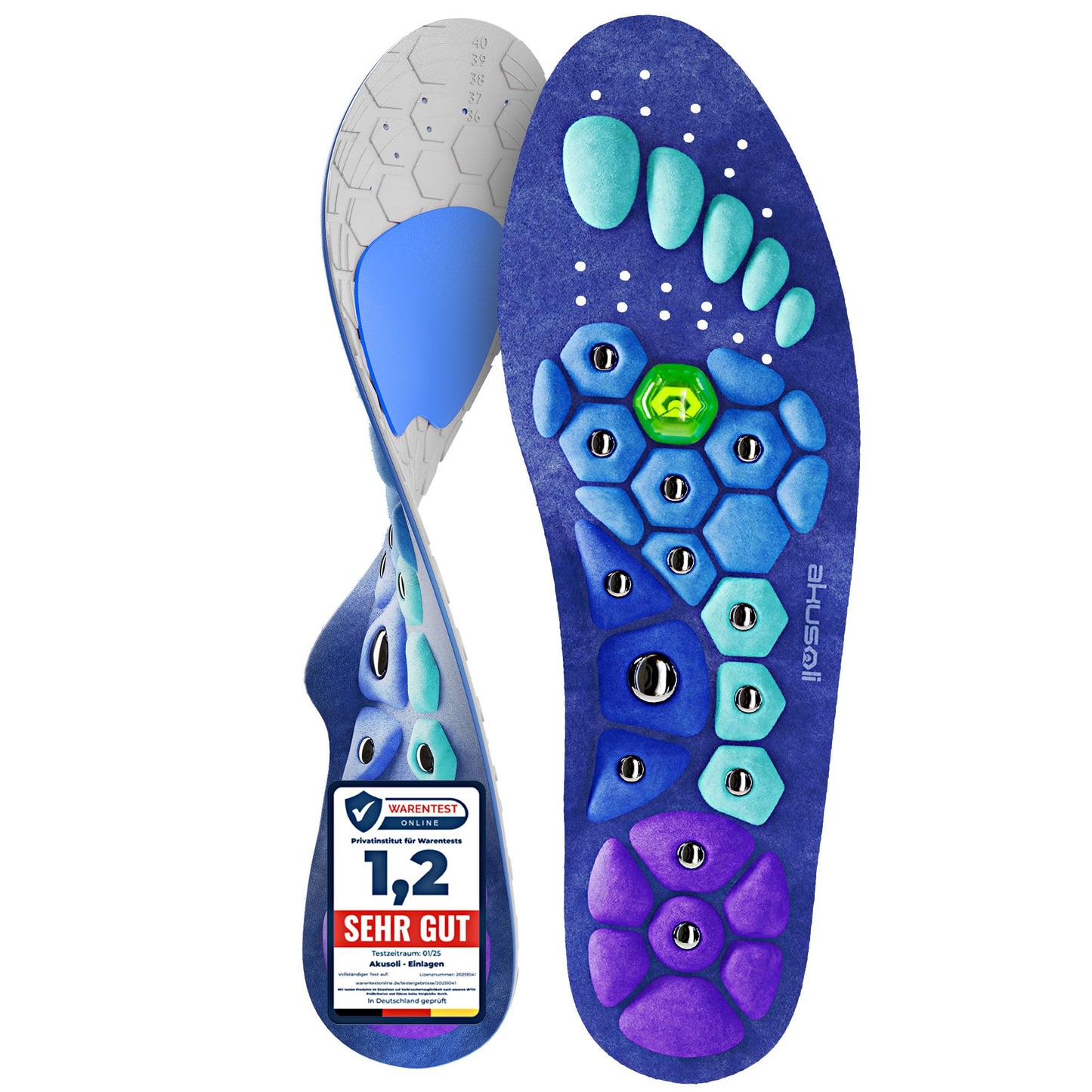 Ganzheitliche Unterstützung für Ihre Füße: Die Akusoli Einlegesohlen bieten eine zweifache Wirkung aus Fußgewölbeunterstützung und magnetischer Akupressurmassage.