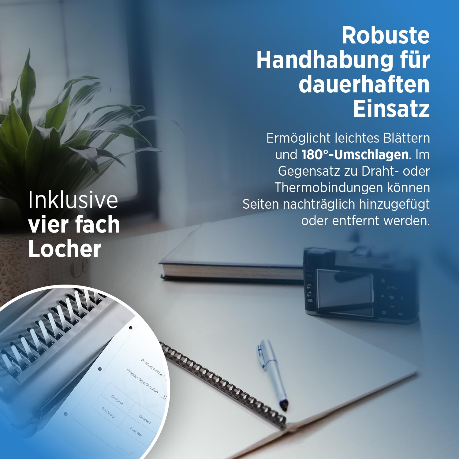 - Flexibles Nachbearbeiten: Seiten können dank Kunststoffbinderücken nachträglich entnommen oder ergänzt werden