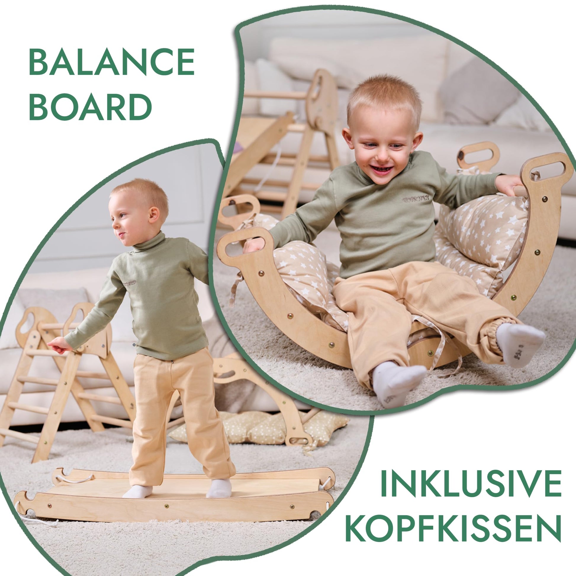 Das vielseitige Set wurde speziell für Kinder von 1-3 Jahren entwickelt und vereint Bewegung, Spiel und Lernen im eigenen Zuhause.